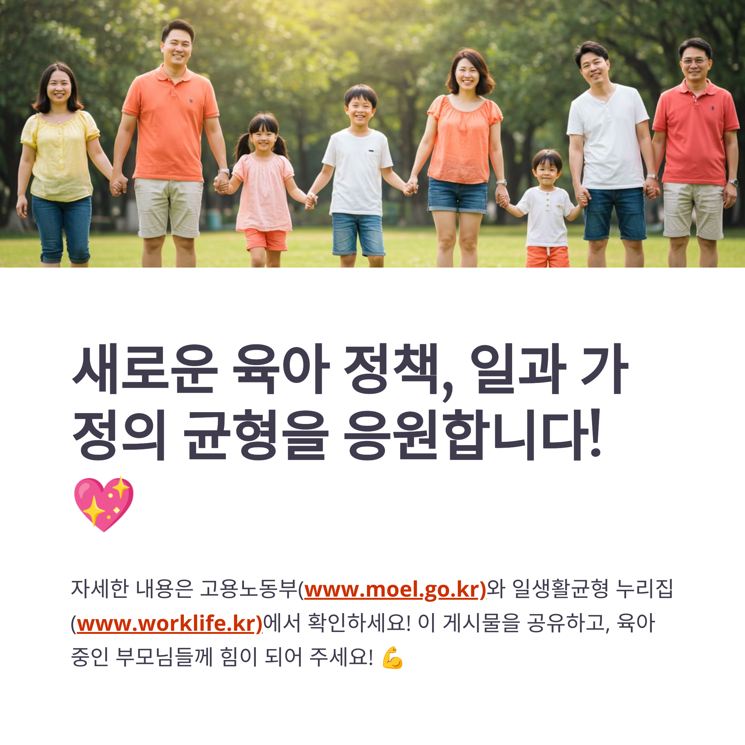 보다 자세한 내용은 **고용노동부 누리집(www.moel.go.kr)과 일생활균형 누리집(www.worklife.kr)**에서 확인할 수 있습니다. 변화된 정책을 적극 활용하여 더욱 안정적인 육아 환경을 만들어 가시길 바랍니다!