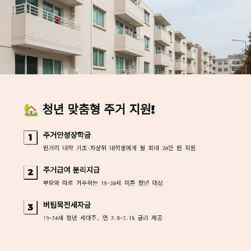 청년들이 안정적으로 생활하며 학업과 취업 준비에 집중할 수 있도록 정부가 다양한 주거 지원 정책을 마련했어요. 주거비 부담을 덜어주고, 저렴한 금리로 대출을 받을 수 있도록 돕는 정책까지! 지금 바로 확인해 보세요.